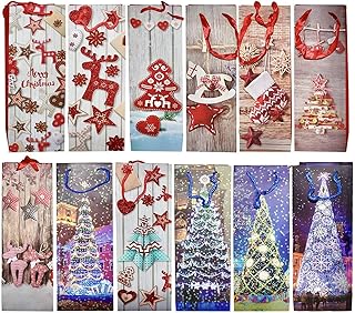 12 Sacs Cadeaux de Vin de Noël Premium| Designs Festifs, Papier Robuste et Poignées Solides| Emballage Pochettes Cadeaux de Bouteille pour Vin, Prosecco, Champagne, Fêtes de Noël.