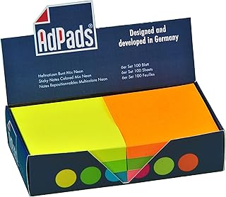 AdPads® Sticky Notes Box Lot de 6 blocs de 100 feuilles colorées fluo 75 x 70 mm